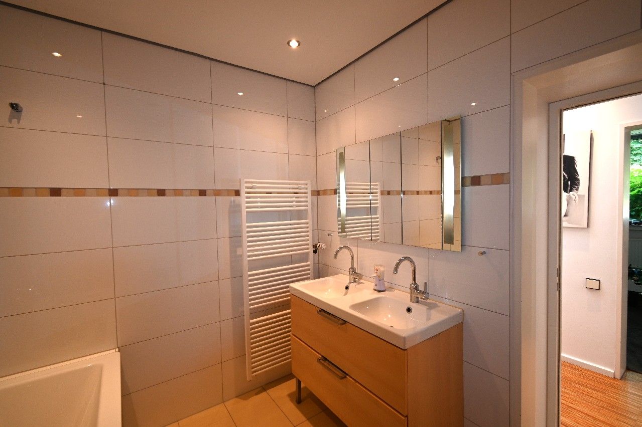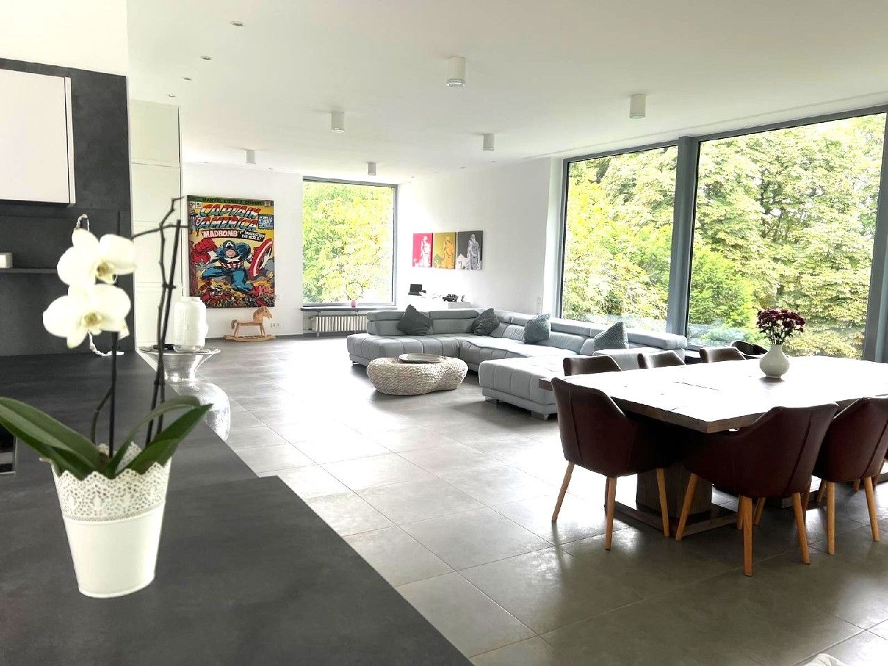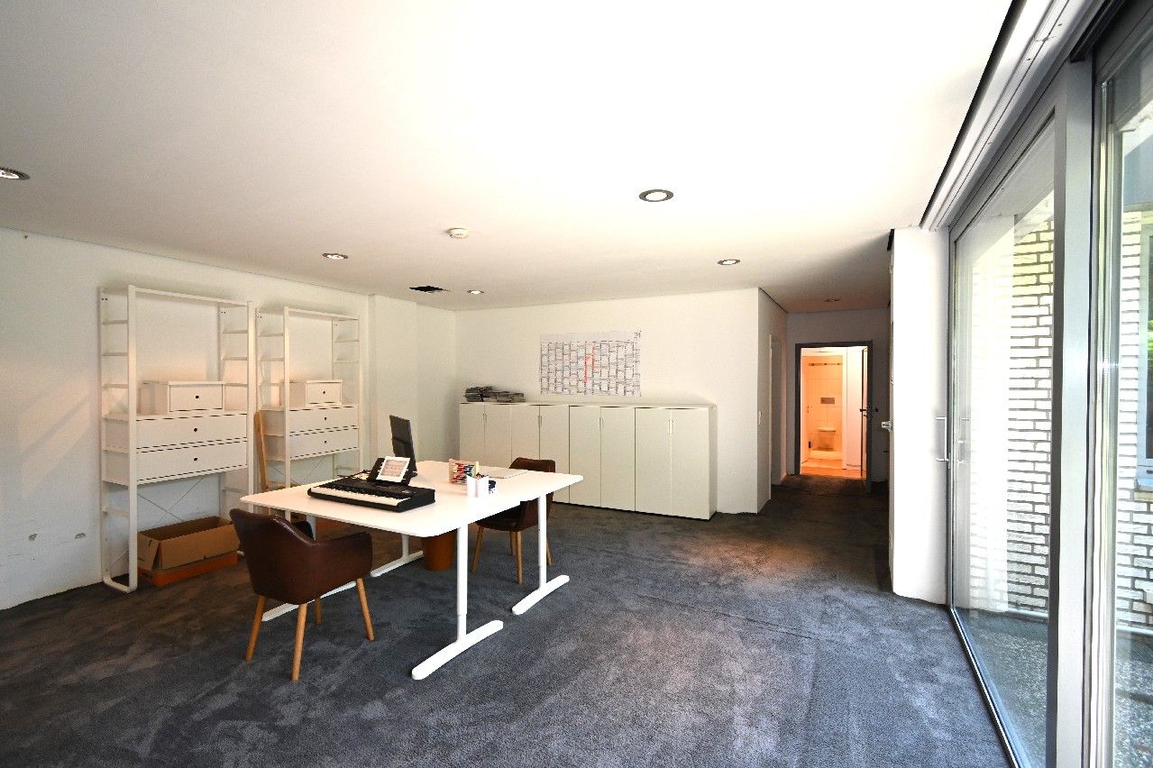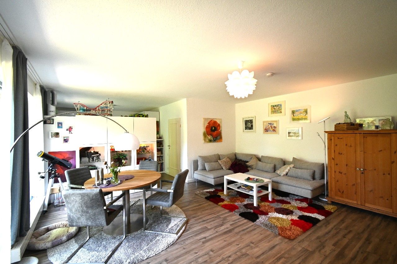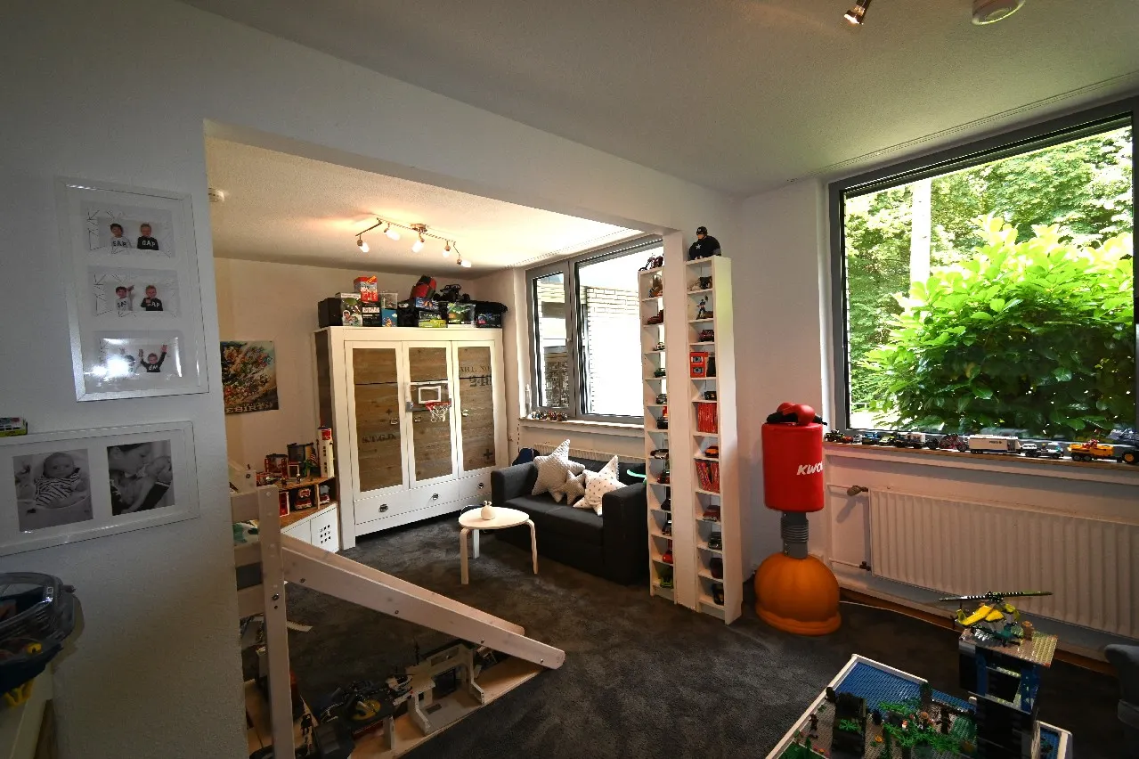 Die großzügige Hauptwohnung im Erdgeschoss ist auch über das Untergeschoss und über die Terrasse zugänglich. Mittelpunkt ist der ca. 85 m² große Wohn- und Essbereich mit charakteristischen, großen Fensterflächen. Die offene Küche mit hochwertiger Einbauküche sowie ein Kaminofen schaffen ein modernes und zugleich behagliches Wohnambiente. Ergänzt wird die Ebene durch ein Büro, drei Schlafzimmer, ein Wannenbad, ein Duschbad und ein Gäste-WC. Das ehemalige Schwimmbad wird aktuell als Hobbyraum genutzt und bewahrt ebenso wie die originalen Einbauschränke den typischen Bauhaus-Charme.