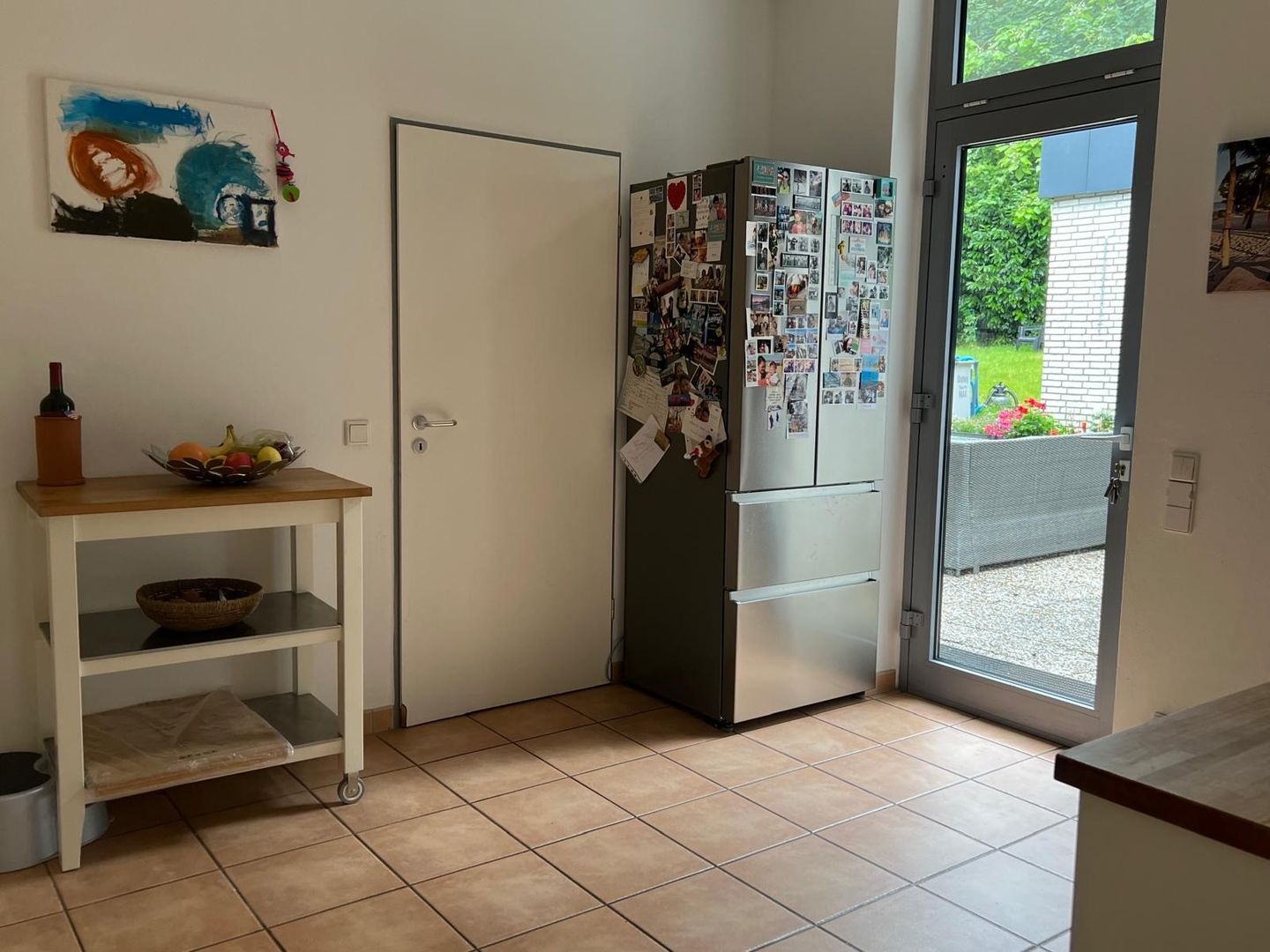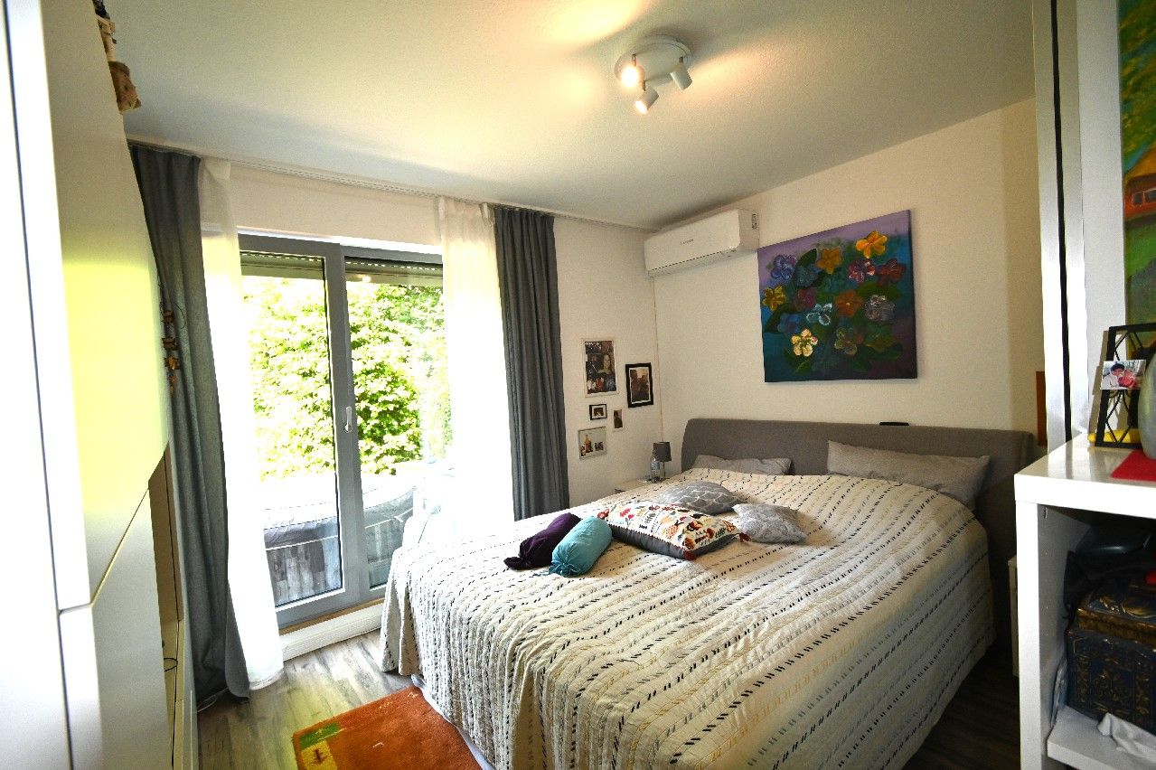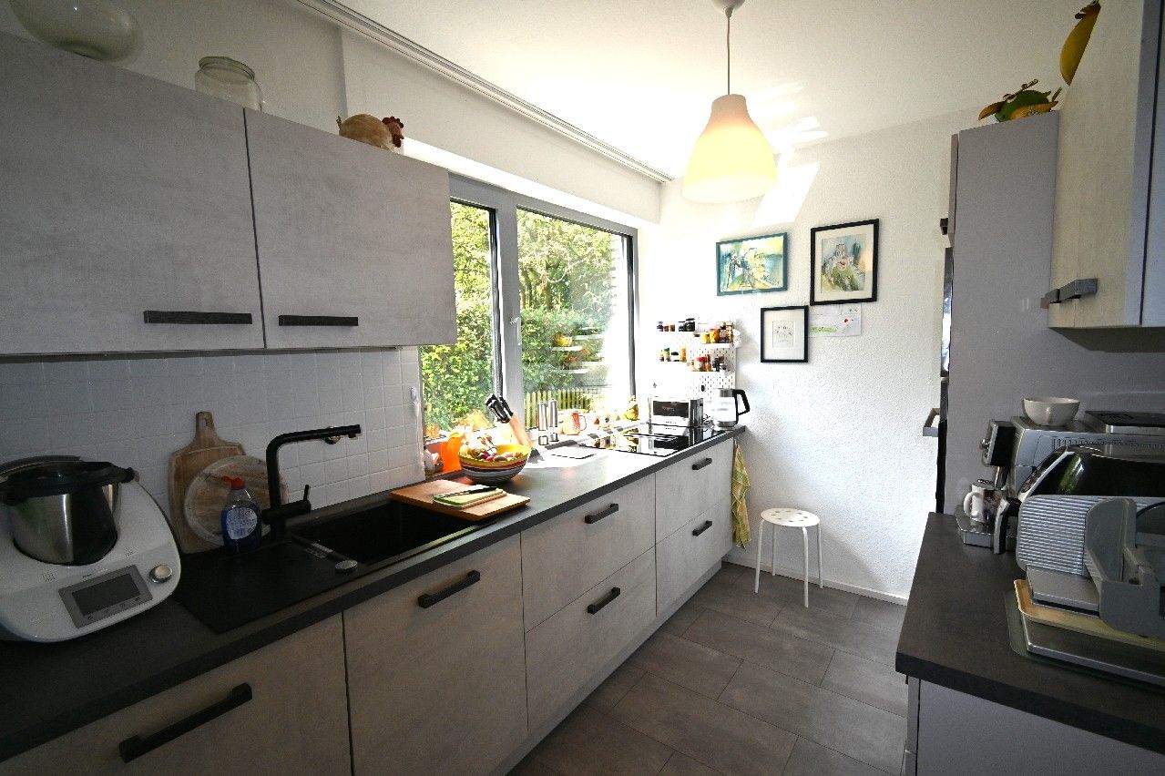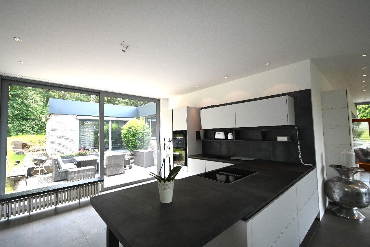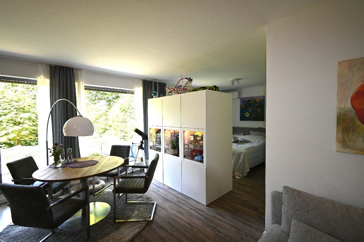 Die großzügige Hauptwohnung im Erdgeschoss ist auch über das Untergeschoss und über die Terrasse zugänglich. Mittelpunkt ist der ca. 85 m² große Wohn- und Essbereich mit charakteristischen, großen Fensterflächen. Die offene Küche mit hochwertiger Einbauküche sowie ein Kaminofen schaffen ein modernes und zugleich behagliches Wohnambiente. Ergänzt wird die Ebene durch ein Büro, drei Schlafzimmer, ein Wannenbad, ein Duschbad und ein Gäste-WC. Das ehemalige Schwimmbad wird aktuell als Hobbyraum genutzt und bewahrt ebenso wie die originalen Einbauschränke den typischen Bauhaus-Charme.