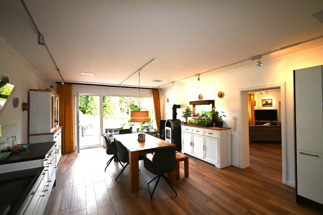 Der weitläufige Wohnbereich mit integrierter Bibliothek führt Sie in die ca. 35 m² große Wohnküche. Diese ist mit einer geschmackvollen Einbauküche ausgestattet und bietet Platz für einen großzügigen Essbereich. Der Kaminofen sorgt zusätzlich für eine behagliche Atmosphäre. Die praktische Vorratskammer rundet diesen Bereich ab.