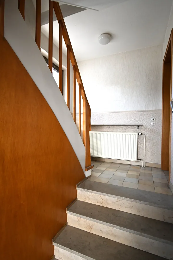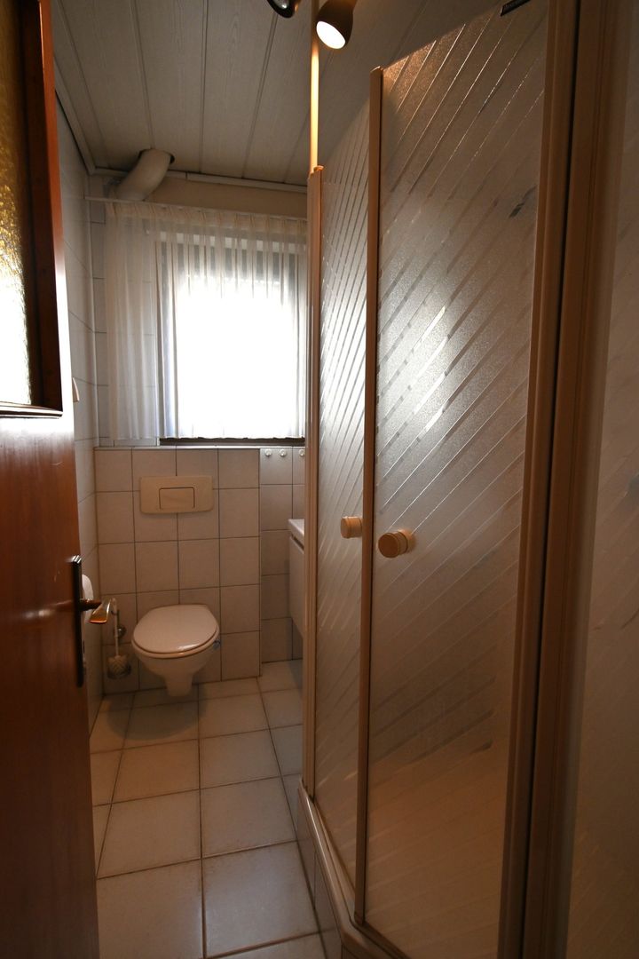 Das 1. Obergeschoss beherbergt eine weitere 2-Zimmer-Wohnung. Die Badezimmer sind funktional ausgestattet: Im Erdgeschoss mit einer Dusche, während im Obergeschoss eine Badewanne zur Verfügung steht.
